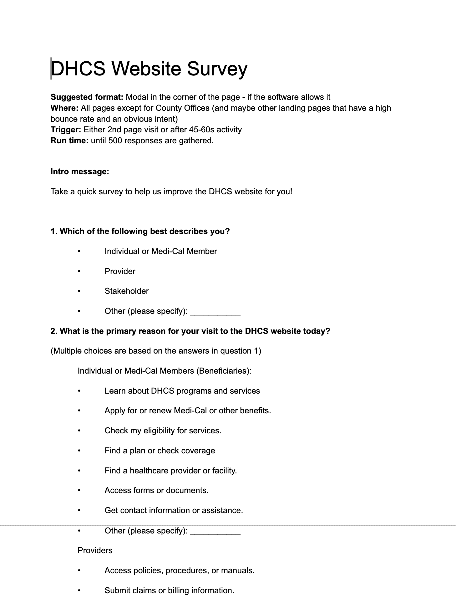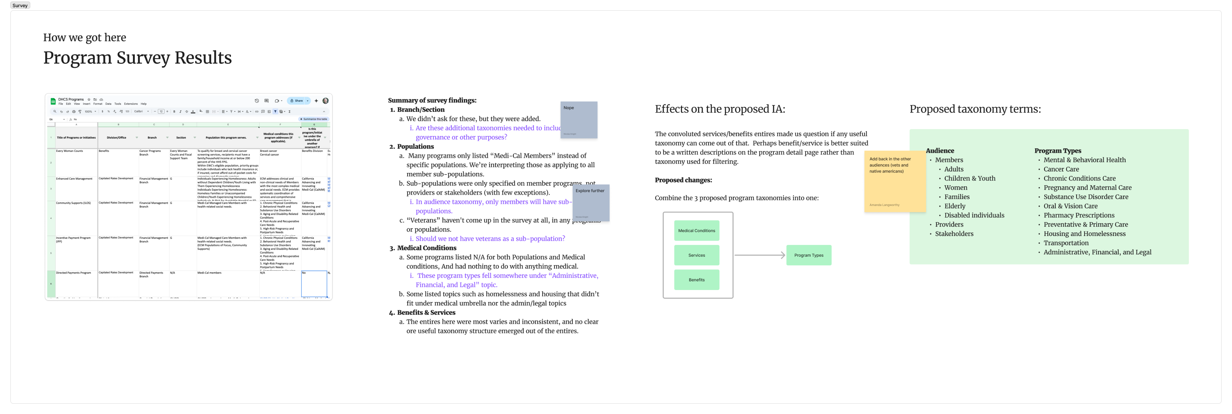 We’ve attempted to build the source of truth for all of the program and services that DHCS offered to the public. We’ve built an internal survey for departments and recruited the department heads to be responsible for filling it out. While the results were rather inconsistent despite our best attempts to get to a consistent answers across departments, we’ve learned enough to built out a taxonomy driven by audience types and service categories.