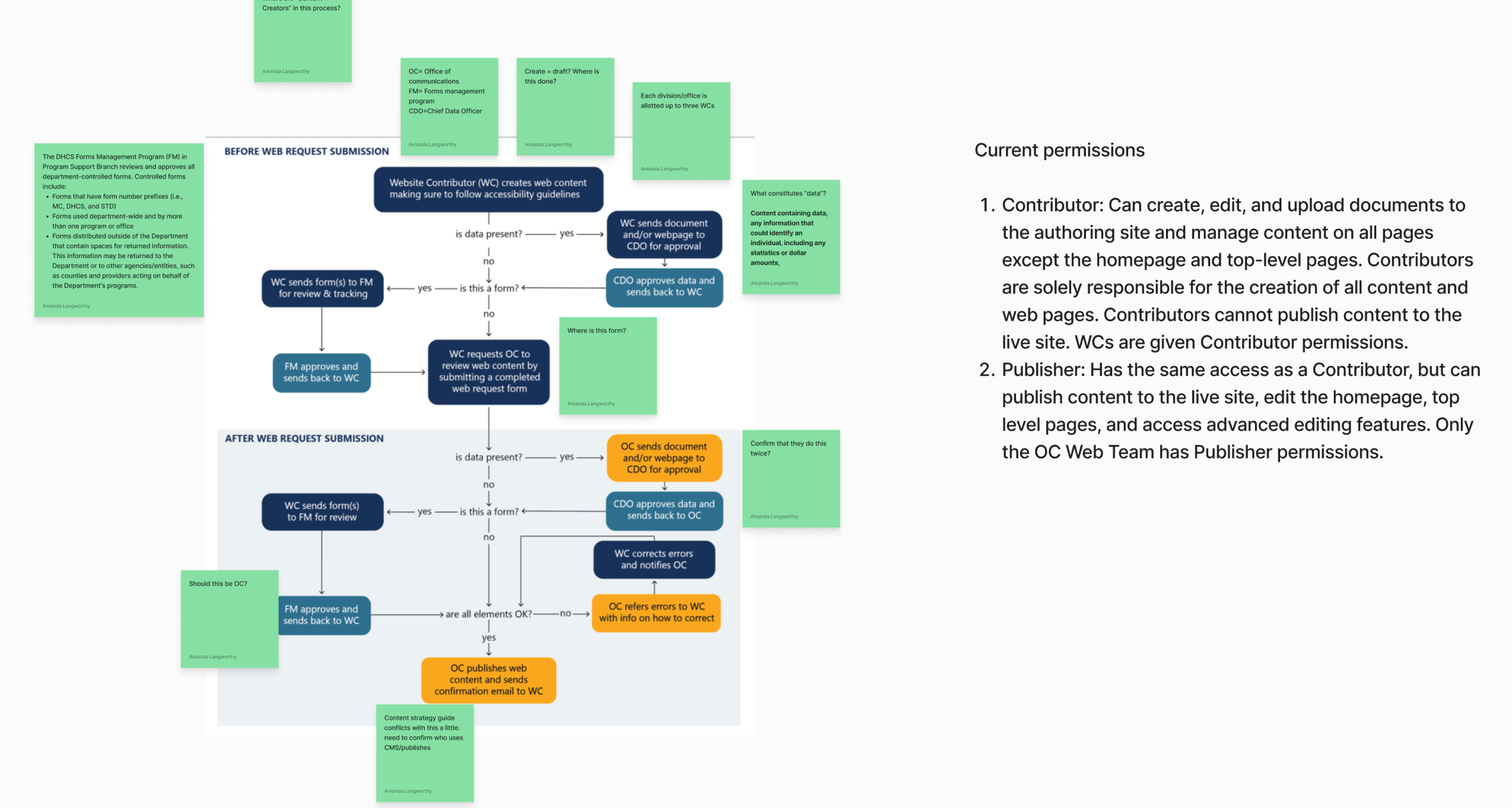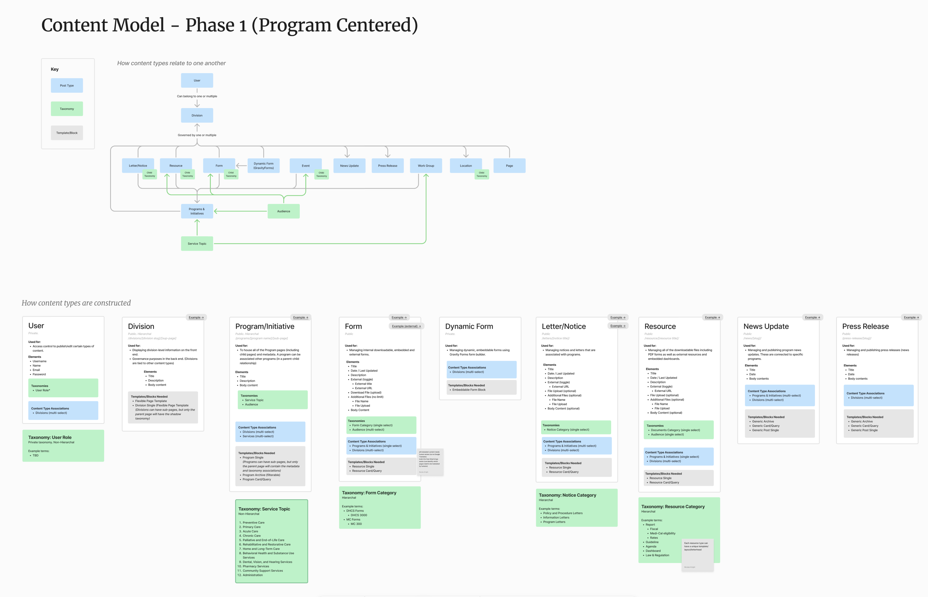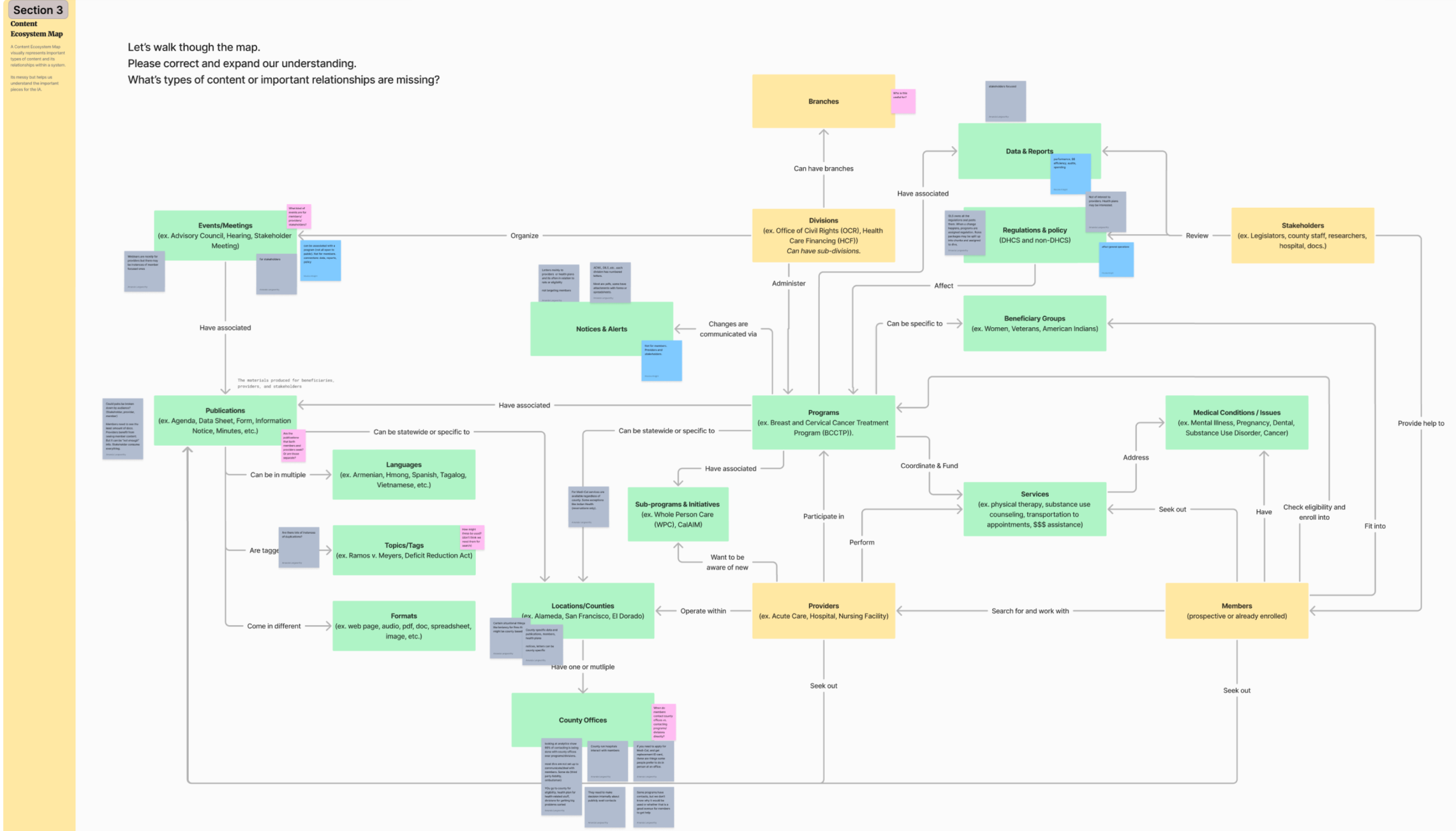 I’ve designed a series of workshops to help us understand the complex organizational structure of DHCS and the layers of content these departments are responsible for producing. My go to is the content ecosystem map, which reveals the relationships and purpose of different content pieces.