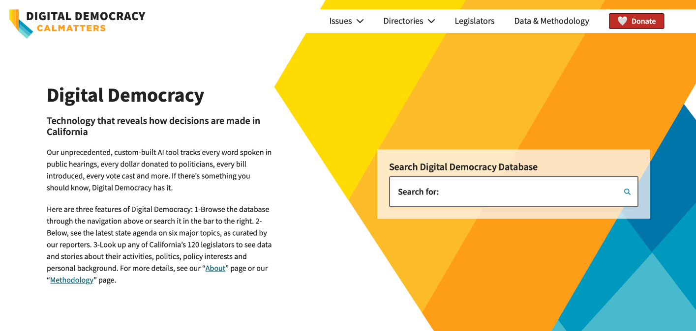Every vote, campaign contribution, behest and gift made to a legislator, every word spoken during a hearing, and every bill amendment and redaction is tracked. There are money breadcrumbs and unexpected influences that reveal our representatives’ true colors. Problem was, this data is largely inaccessible to anyone who is not a reporter or lacks political know-how to make sense of all this data (i.e. most of us).