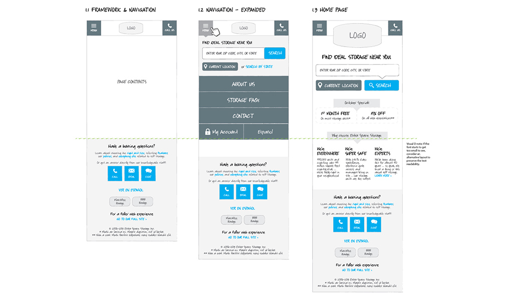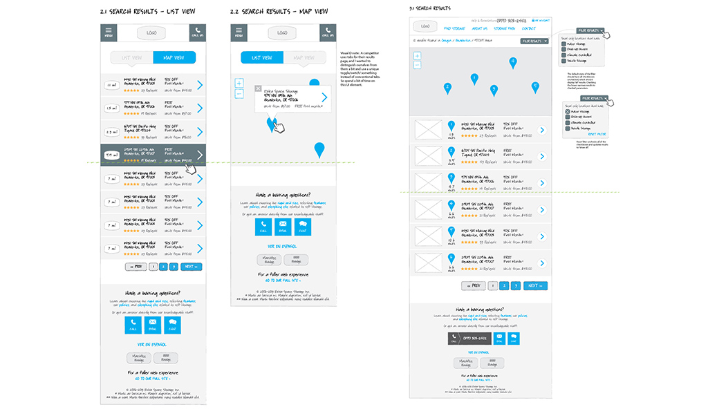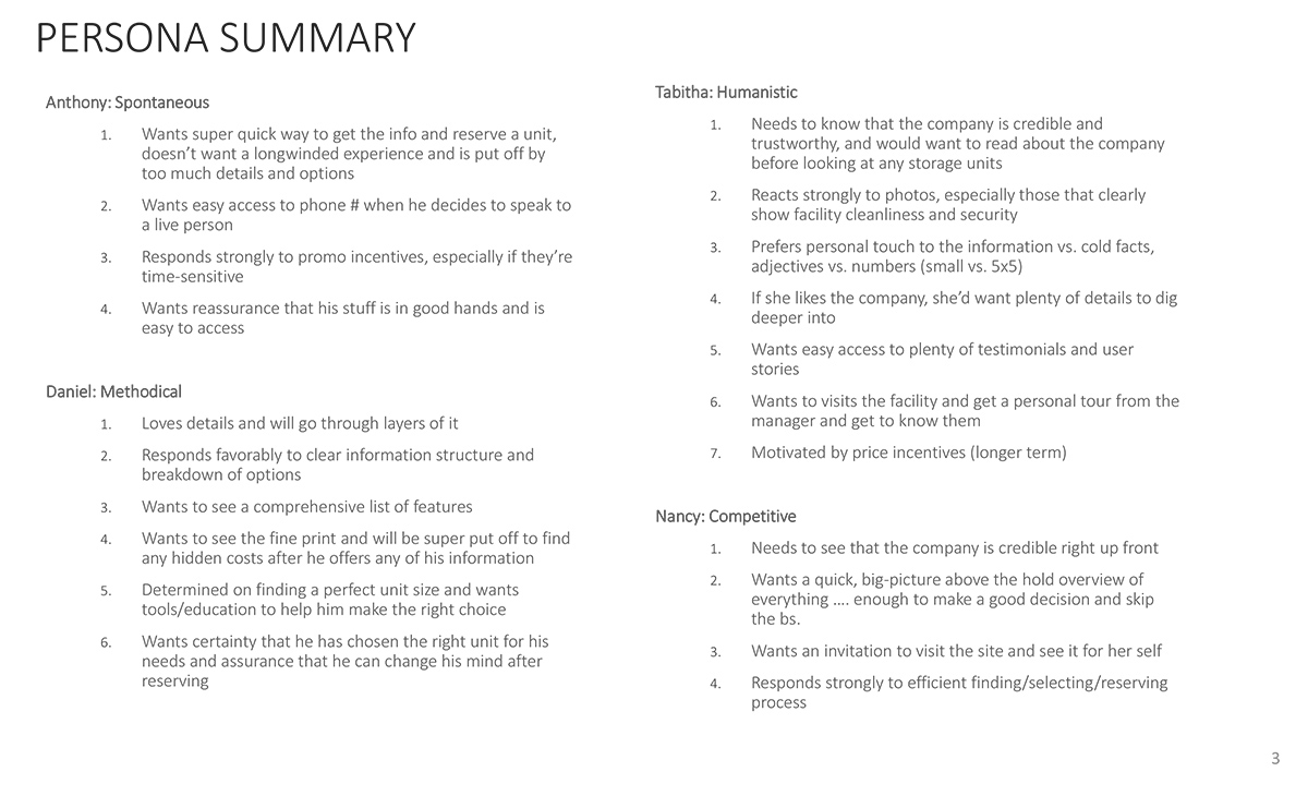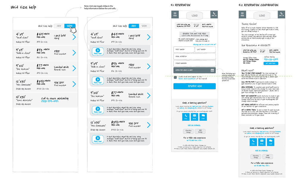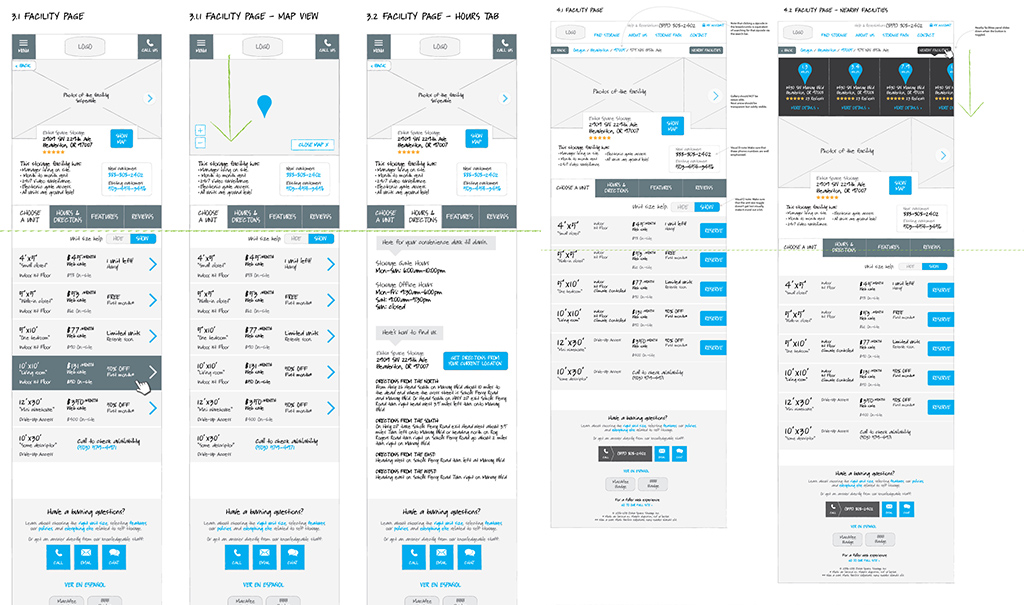 We begun by evaluating the existing experience to uncover any obvious usability problems and missed opportunities as well as evaluating competitor’s sites to see common trends and pitfalls. We then gathered a bunch of qualitative info from the customer service team and synthesized it into 4 personas with core adjectives: spontaneous, humanistic, methodical, competitive. Each of the adjectives gave an insight into certain flow and interaction ideas. One of the notable ones was the fact that most people had trouble visualizing space size, (“how big is 10’x30′ ?”). We came up with familiar spacing references, or nicknames (eg. “walk-in closet”, “one bedroom,” etc…) to help user make the choice of what size storage they need quicker.