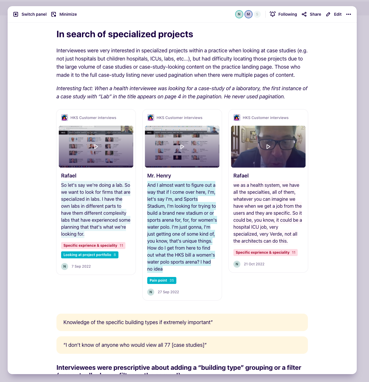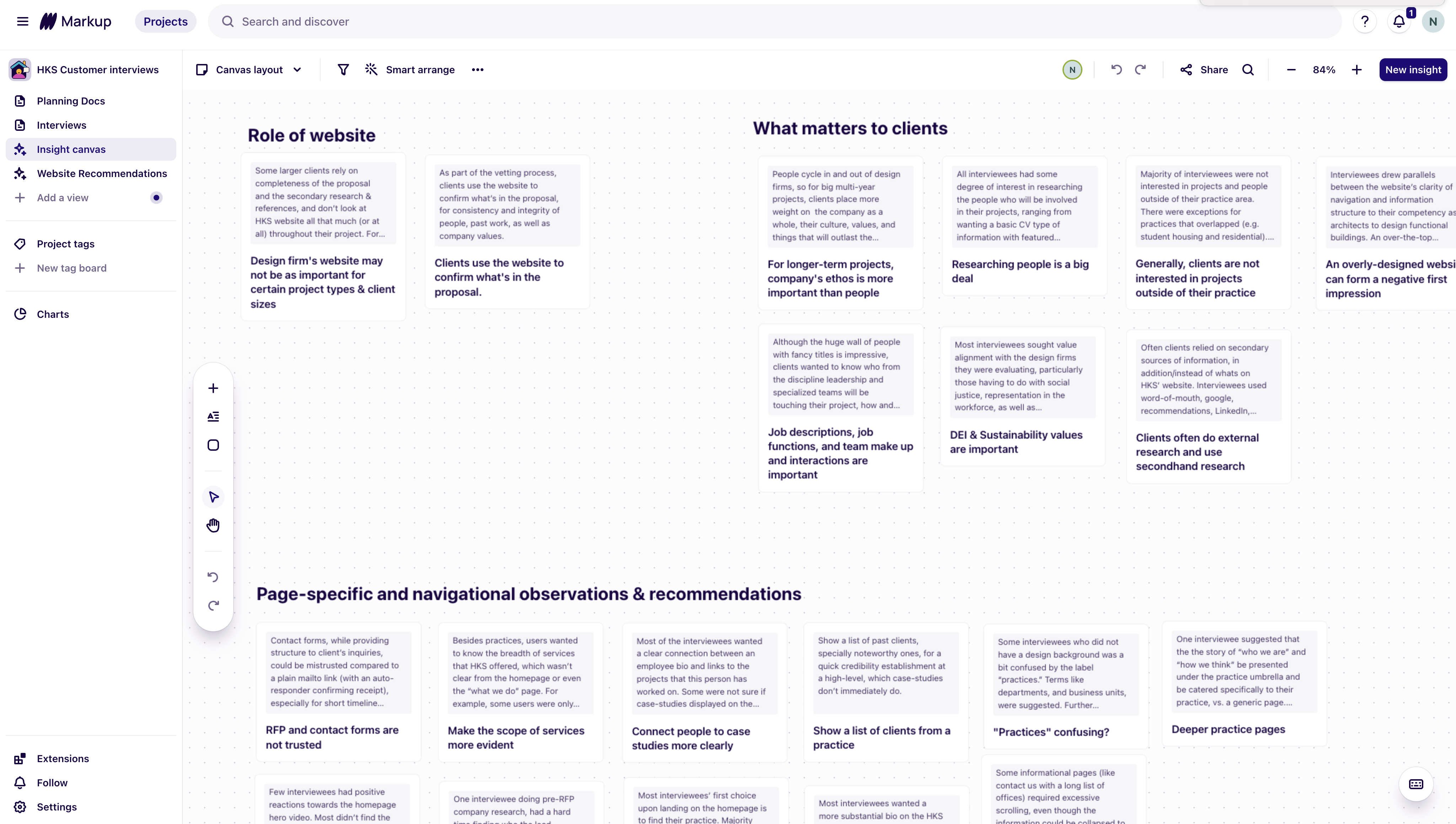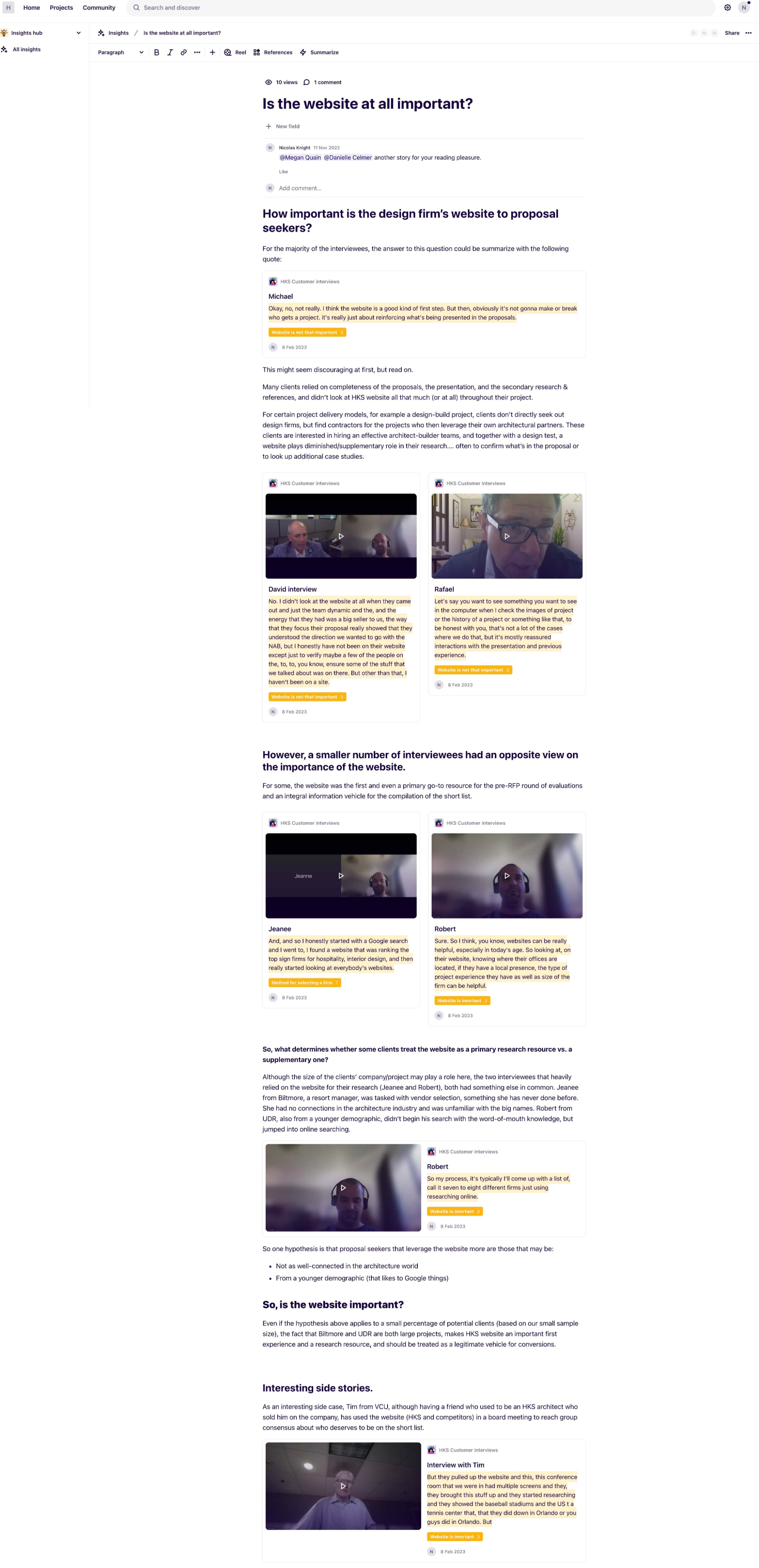 I’ve planed and ran a series of interviews with current and recent clients and used Dovetail for the entire research process: setting up research goals, developing questions, interviewee management, and most impressive set of synthesis and presentation features (e.g., insight canvas and research stories).