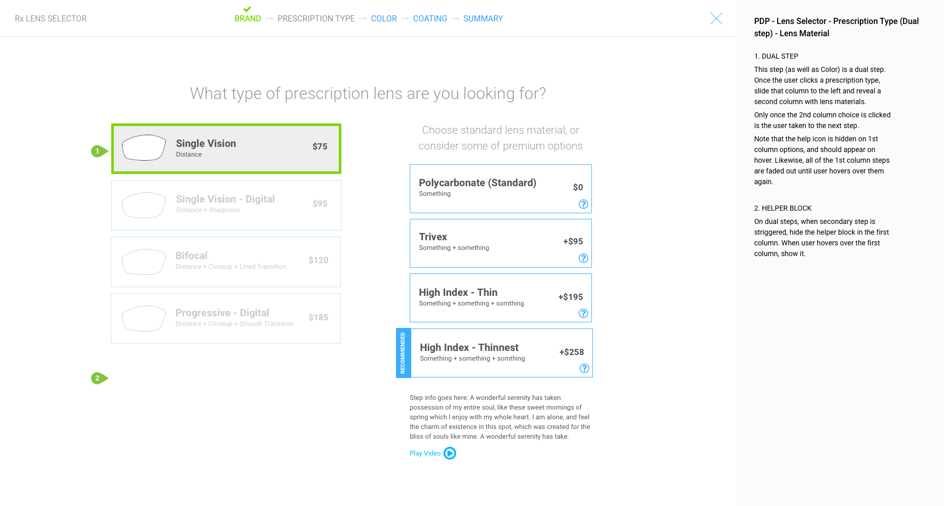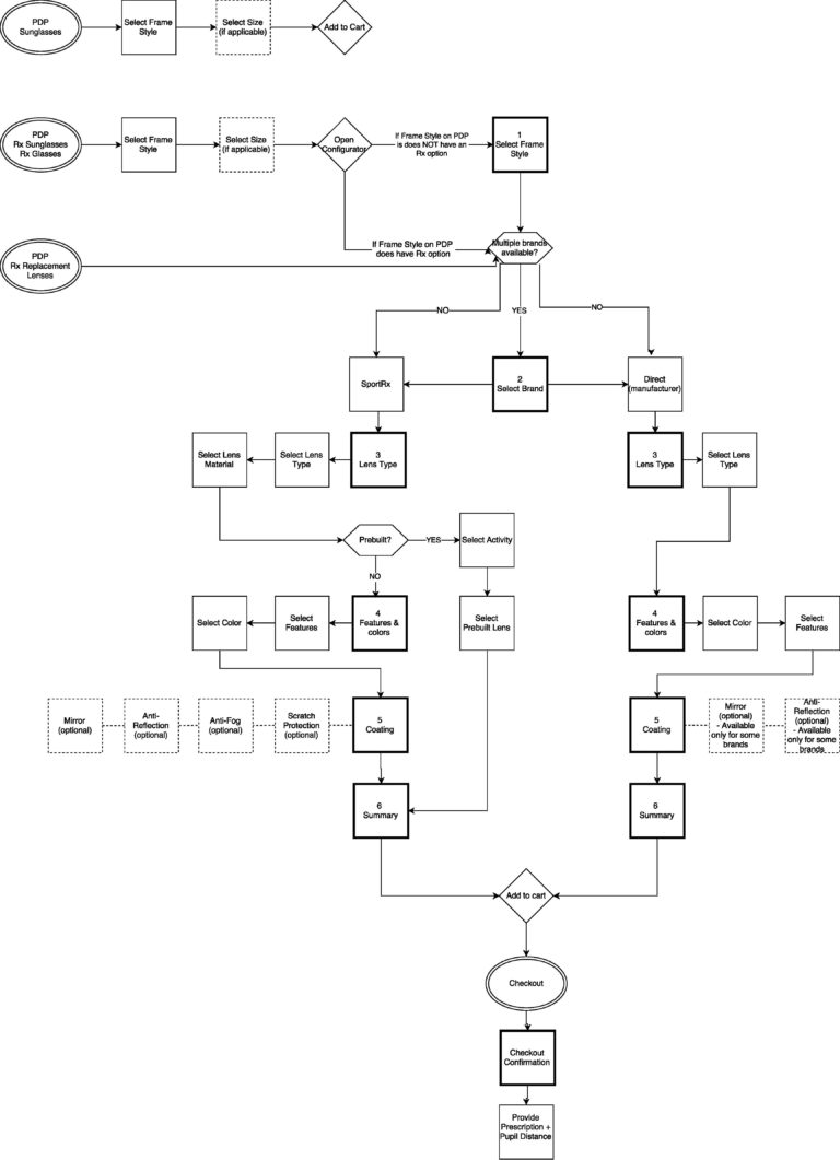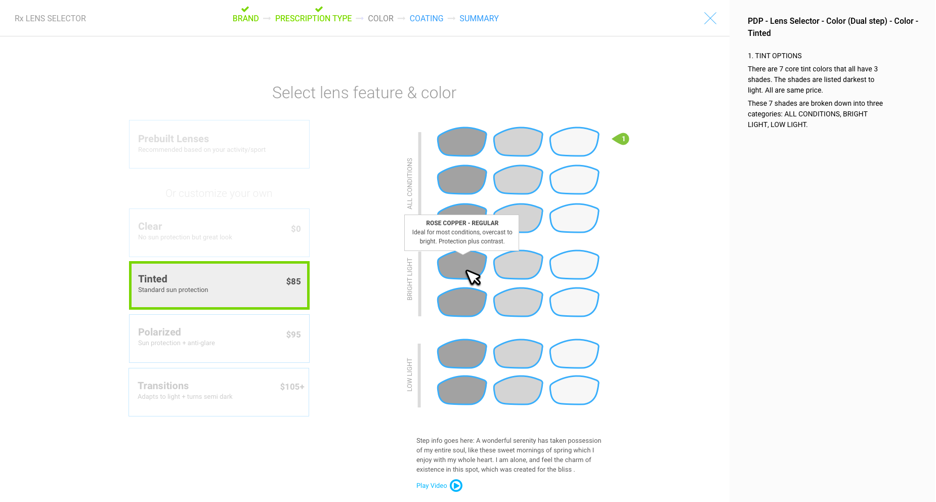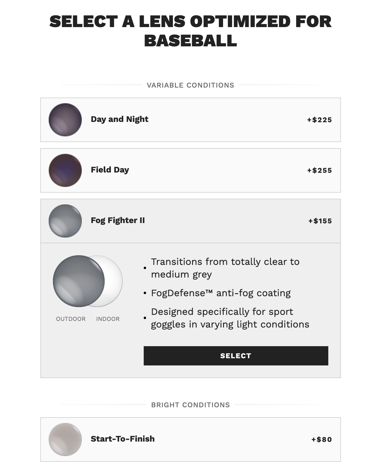 SportRx custom lenses are highly customizable, but unless you’re a dedicated eyewear nerd, perusing dozens of colors and finishing options is just too much for an average user. Decision paralysis is a common issue in eComm. We’ve simplified the selection process by bundling lens customizations into easy to understand and activity-specific bundles that significantly improved conversions.